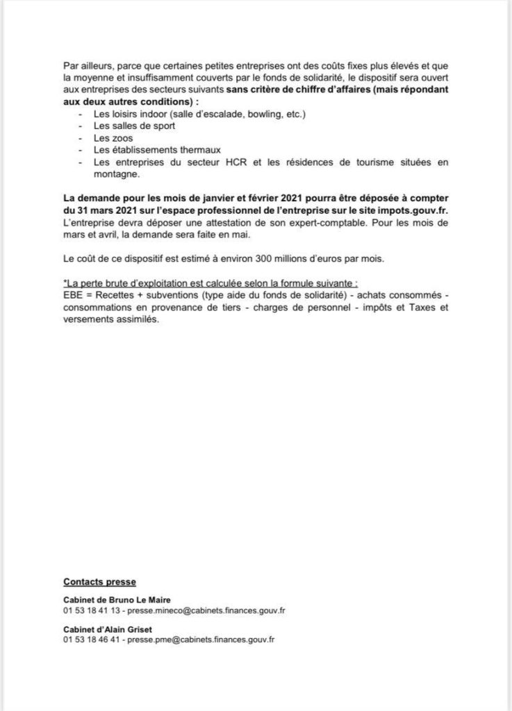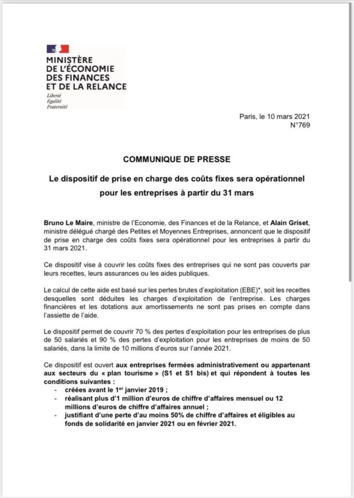 Bruno Le Maire, ministre de l’Economie, des Finances et de la Relance, et Alain Griset, ministre délégué chargé des Petites et Moyennes Entreprises, annoncent que le dispositif de prise en charge des coûts fixes sera opérationnel pour les entreprises à partir du 31 mars 2021.
